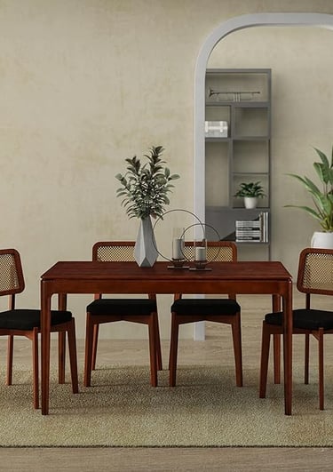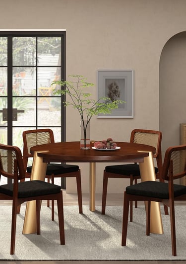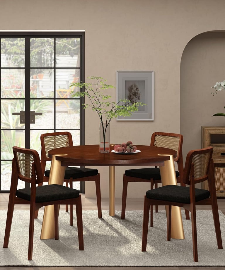 Walnut & rubberwood table with rattanchairs